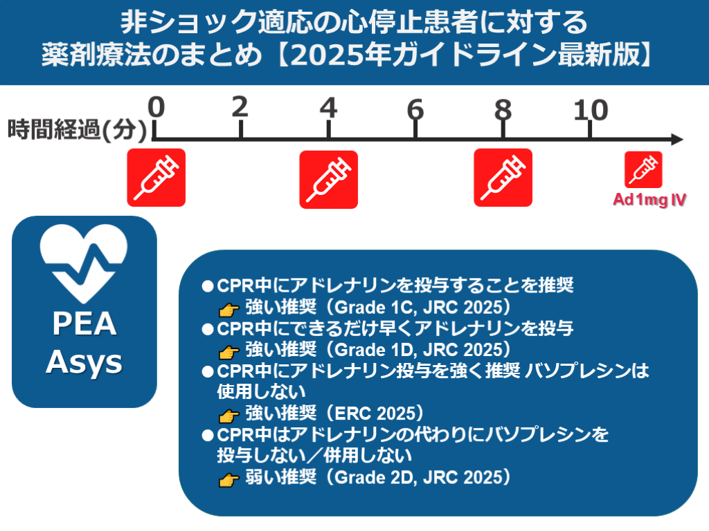 Asys 時間経過(分) 0 2 4 6 8 10 ●CPR中にアドレナリンを投与することを推奨 👉 強い推奨(Grade 1C, JRC 2025)