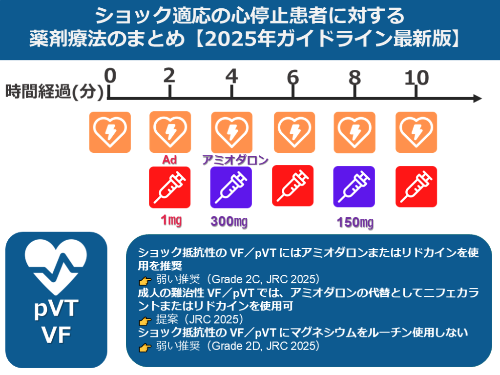 VF 時間経過(分) 0 2 4 6 8 10 300㎎ 150㎎ ショック抵抗性の VF/pVT にはアミオダロンまたはリドカインを使用を推奨👉 弱い推奨(Grade 2C, JRC 2025)