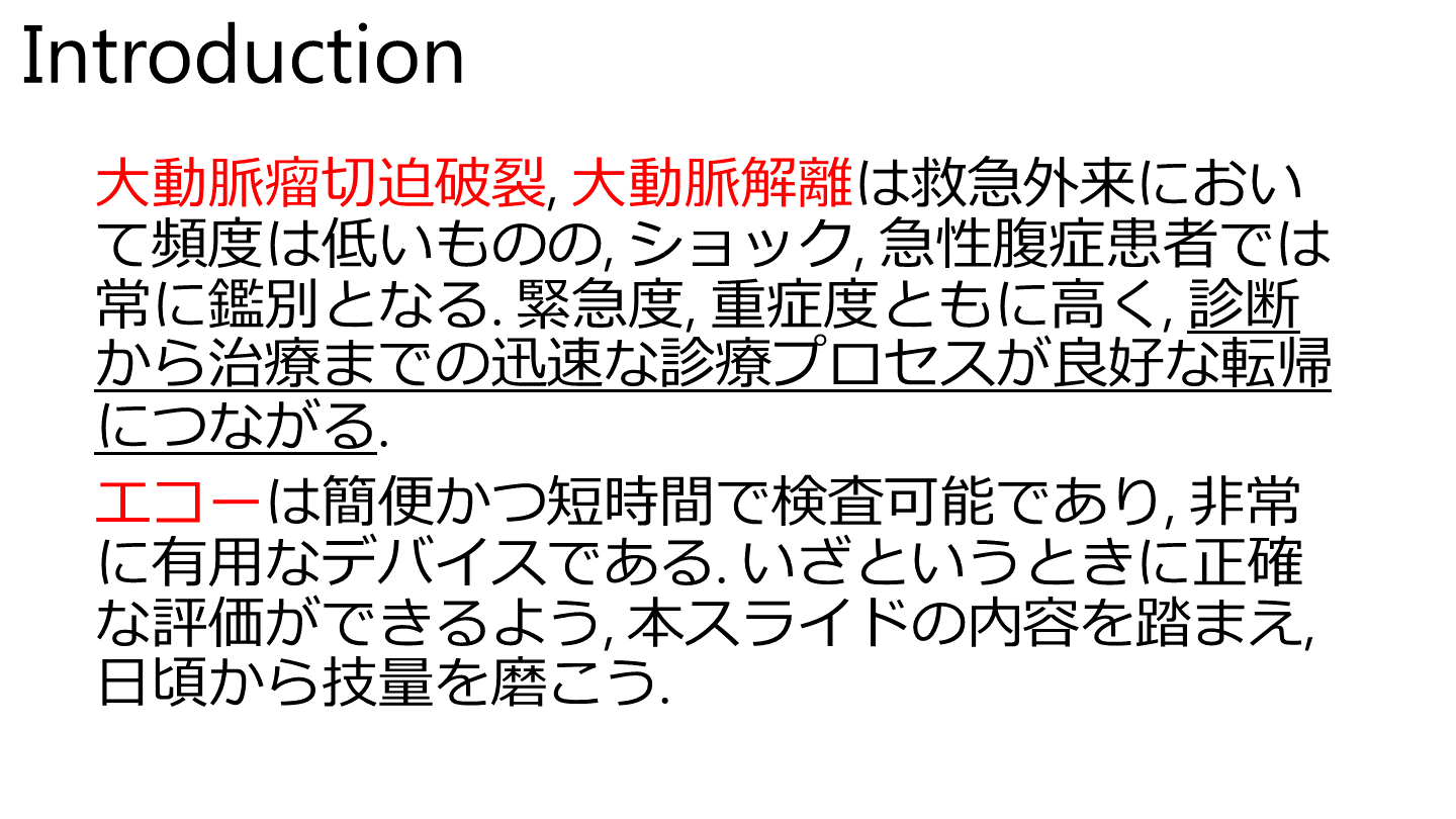 #2. Introduction 大動脈瘤切迫破裂, 大動脈解離は救急外来において頻度は低いものの, ショック, 急性腹症患者では常に鑑別となる. 緊急度, 重症度ともに高く, 診断から治療までの迅速な診療プロセスが良好な転帰につながる.