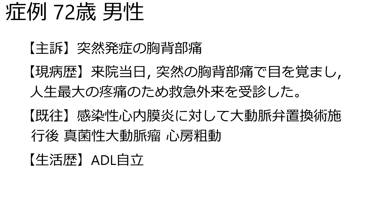 【現病歴】来院当日, 突然の胸背部痛で目を覚まし, 人生最大の疼痛のため救急外来を受診した。