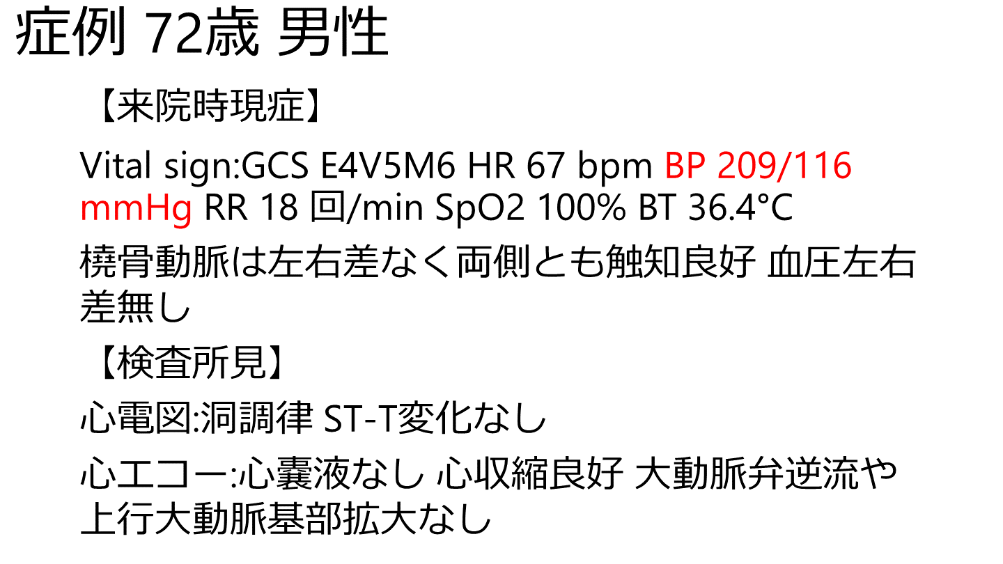 Vital sign:GCS E4V5M6 HR 67 bpm BP 209/116 mmHg RR 18 回/min SpO2 100% BT 36.4℃