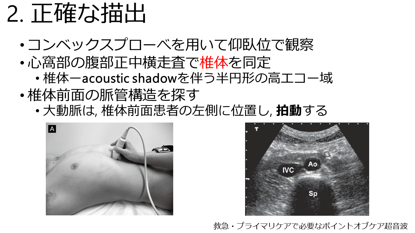 心窩部の腹部正中横走査で椎体を同定