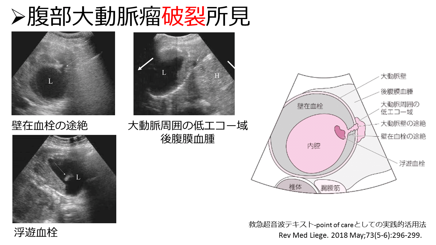 #19. 腹部大動脈瘤破裂所見 Rev Med Liege. 2018 May;73(5-6):296-299. 浮遊血栓 大動脈周囲の低エコー域