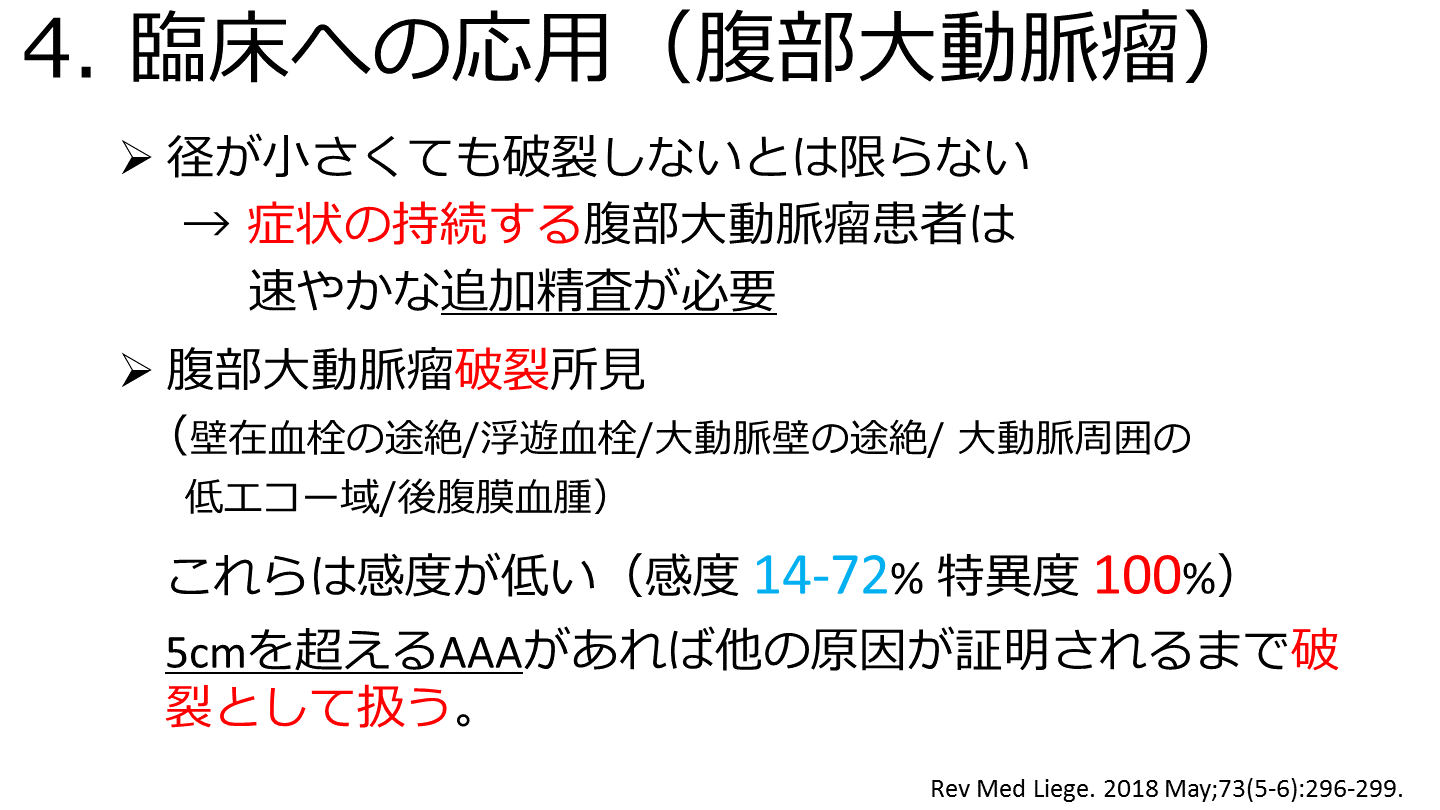 5cmを超えるAAAがあれば他の原因が証明されるまで破裂として扱う。 Rev Med Liege. 2018 May;73(5-6):296-299.