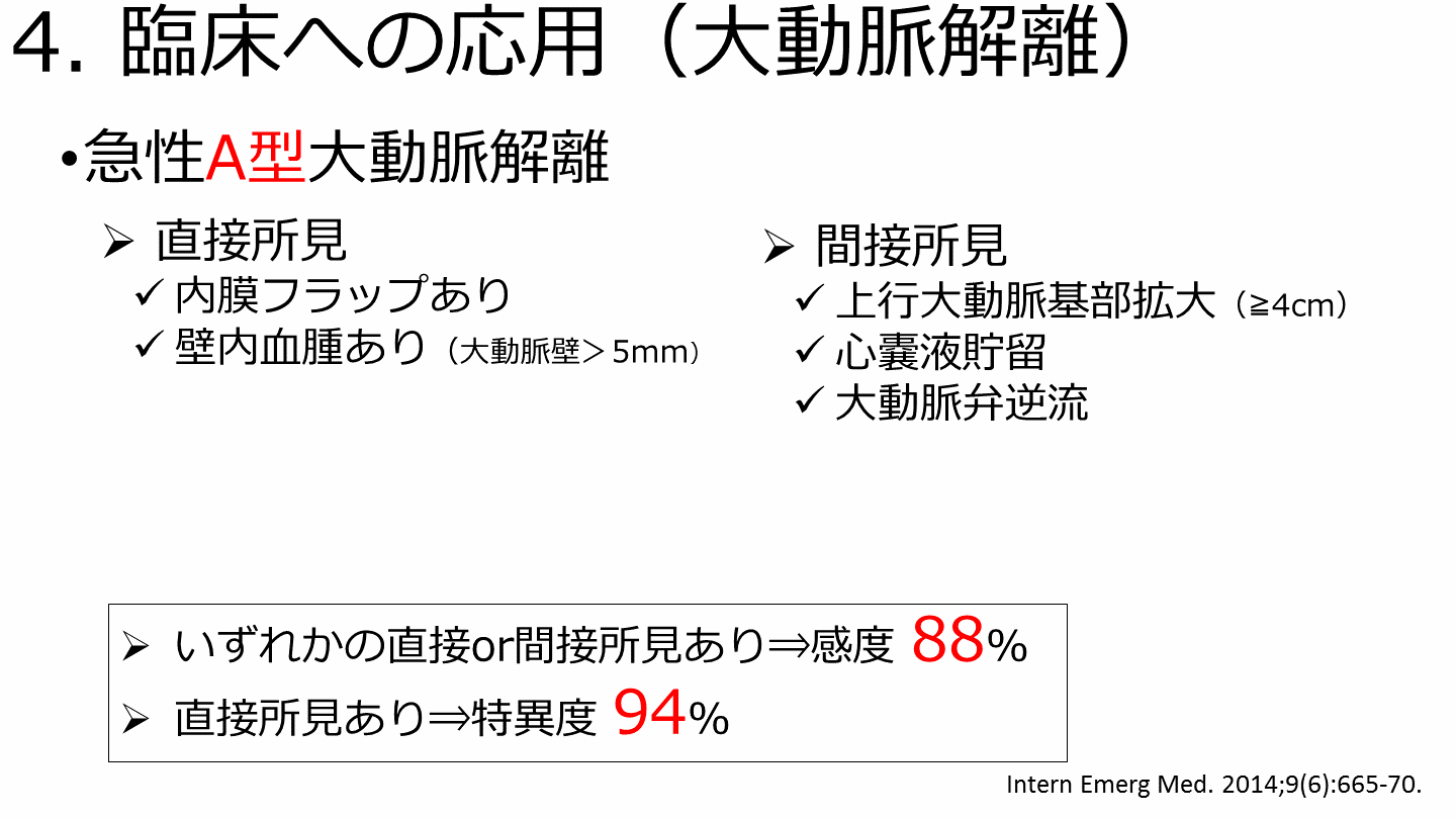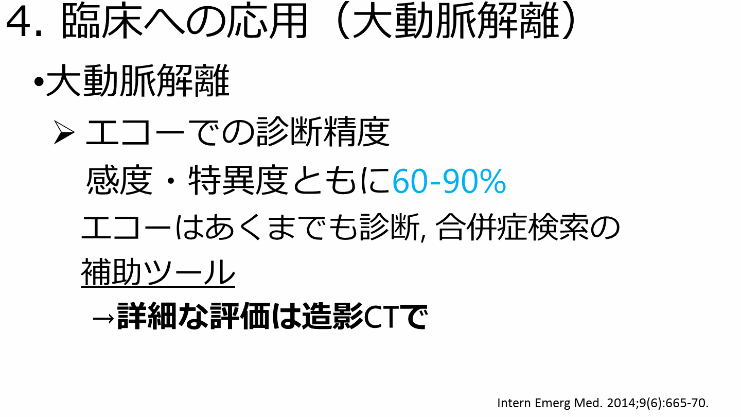 エコーは大動脈解離の診断, 合併症検索の一助となるが, 評価を固執しすぎるべきではない