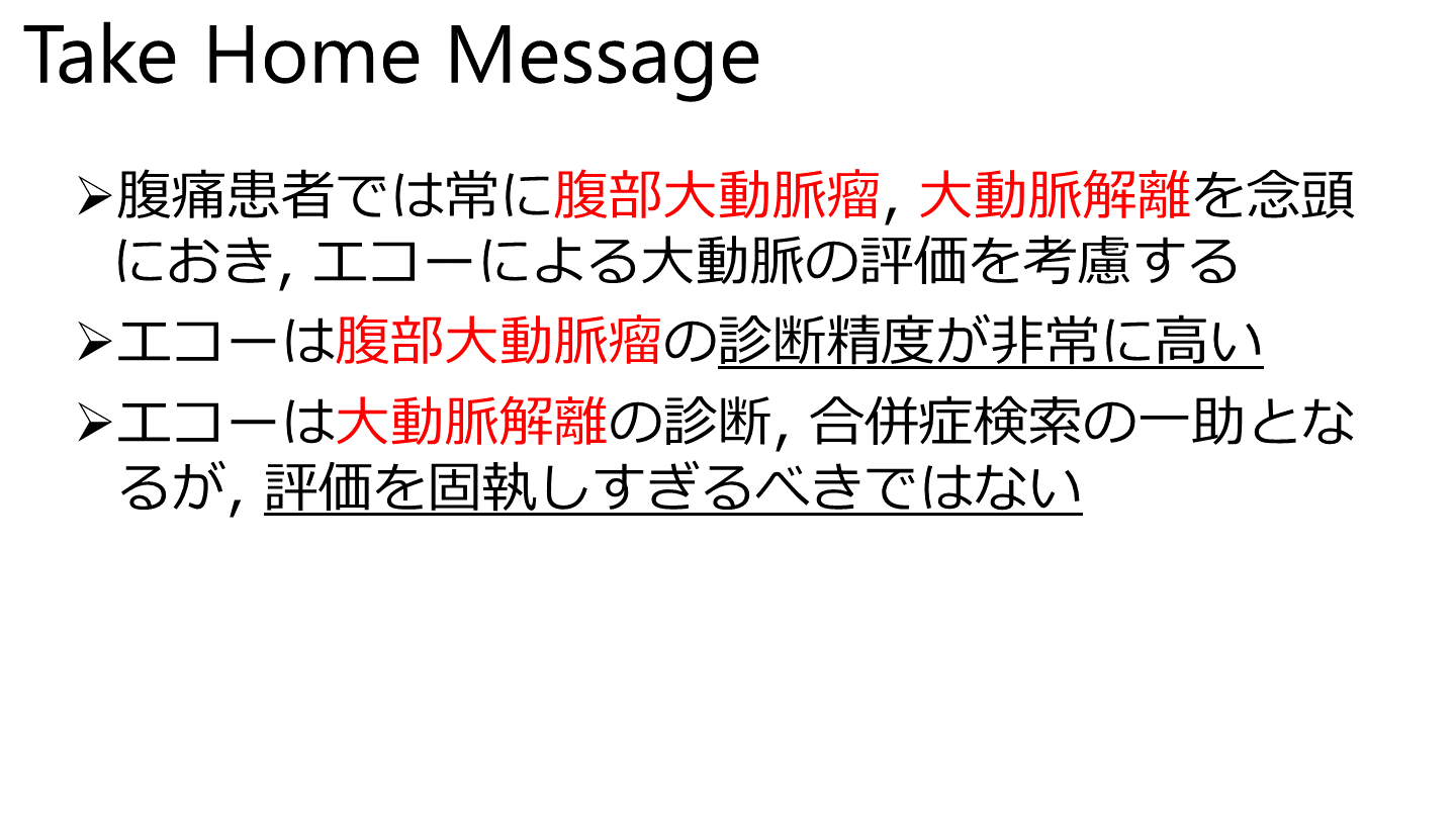 #31. Take Home Message 腹痛患者では常に腹部大動脈瘤, 大動脈解離を念頭におき, エコーによる大動脈の評価を考慮する