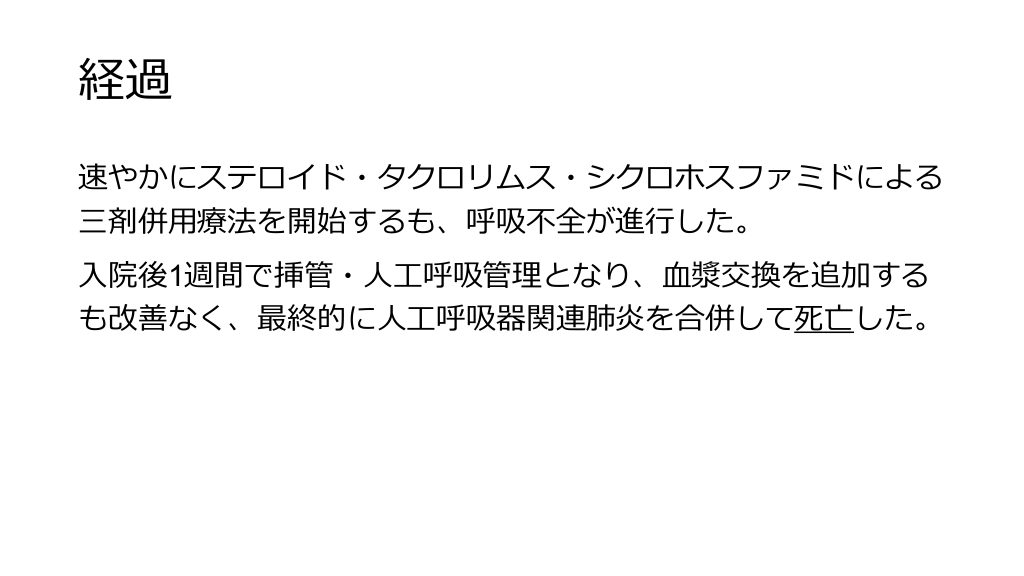 #10. 経過 速やかにステロイド・タクロリムス・シクロホスファミドによる 三剤併用療法を開始するも、呼吸不全が進行した。 入院後1週間で挿管・人工呼吸管理となり、血漿交換を追加する も改善なく、最終的に人工呼吸器関連肺炎を合併して死亡した。