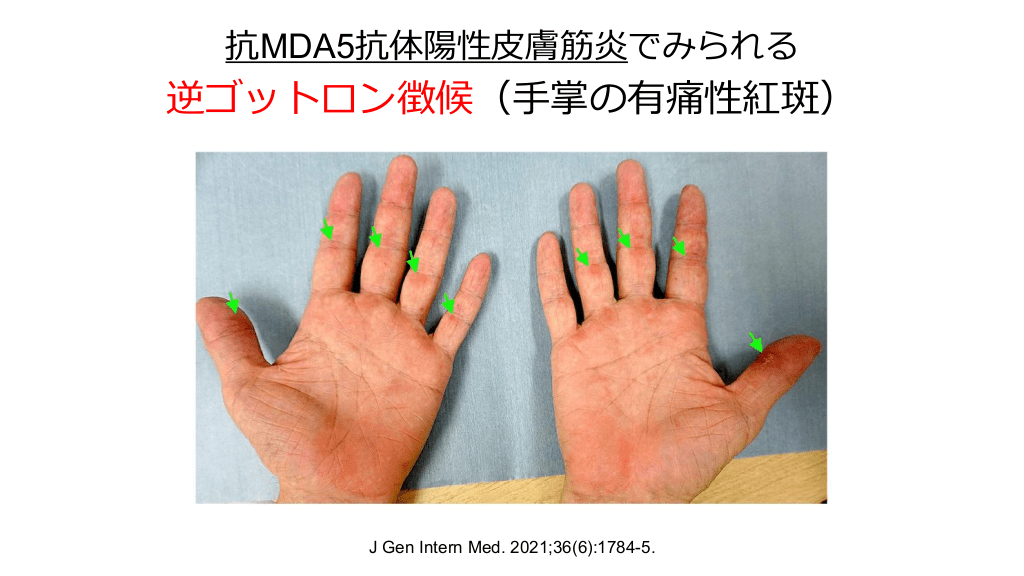 #12. 抗MDA5抗体陽性皮膚筋炎でみられる 逆ゴットロン徴候(手掌の有痛性紅斑) J Gen Intern Med. 2021;36(6):1784-5.