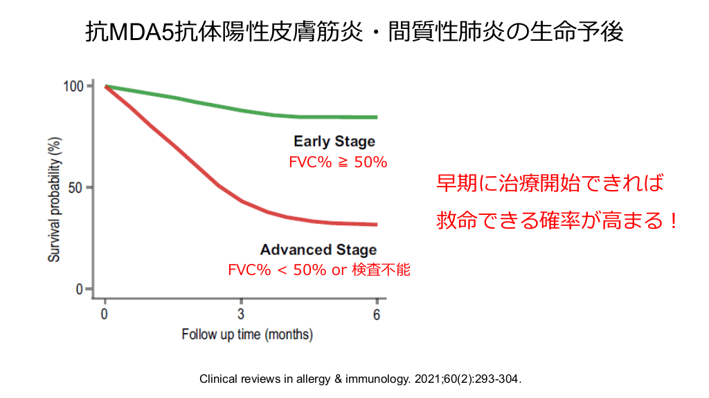 #13. 抗MDA5抗体陽性皮膚筋炎・間質性肺炎の生命予後 FVC% ≧ 50% 早期に治療開始できれば 救命できる確率が高まる! FVC% < 50% or 検査不能 Clinical reviews in allergy & immunology. 2021;60(2):293-304.