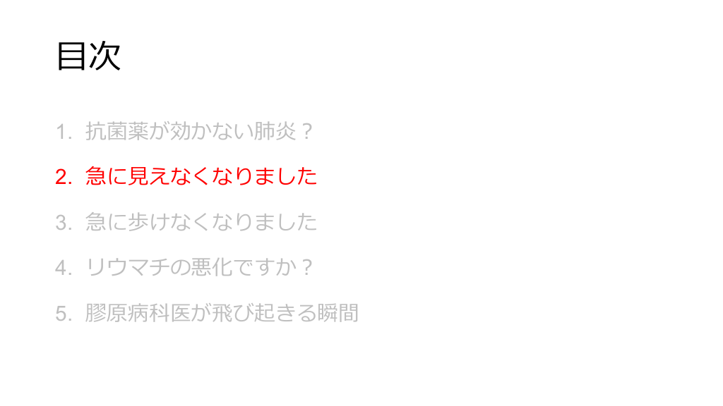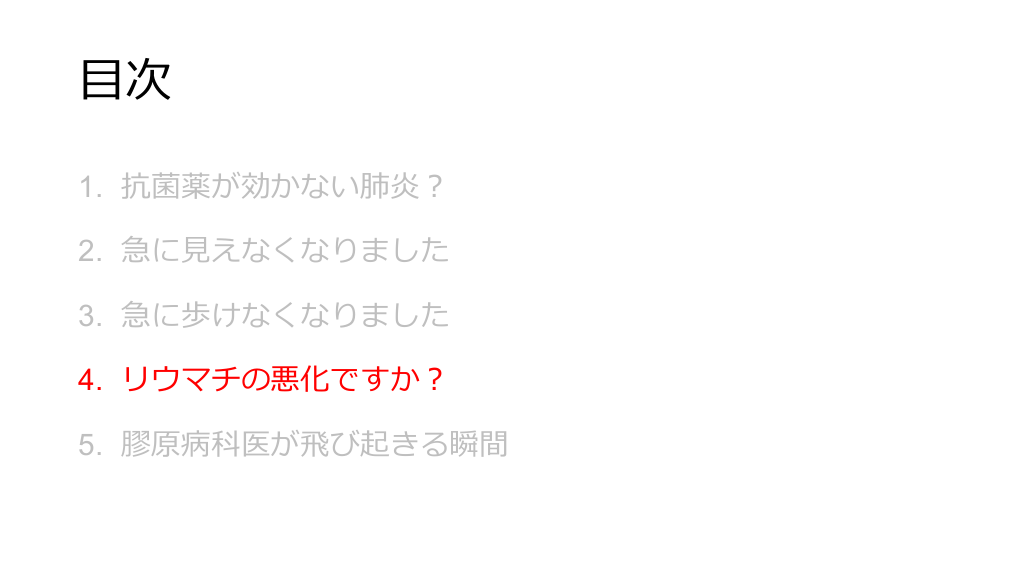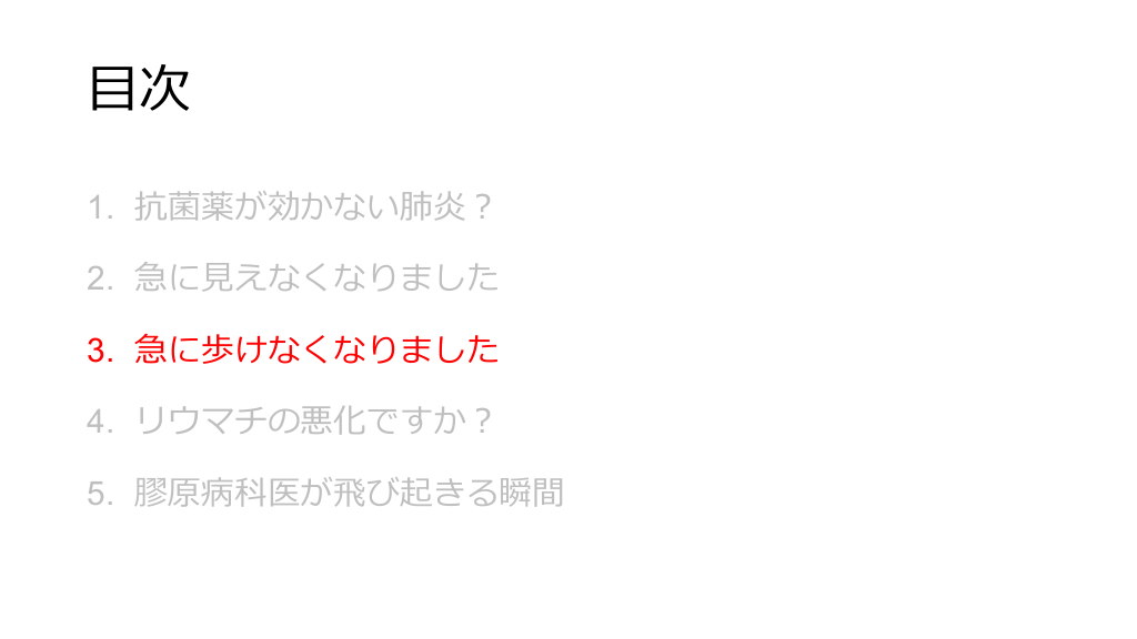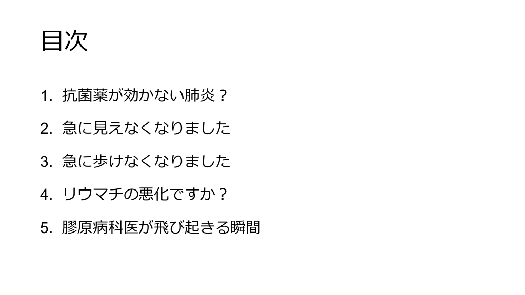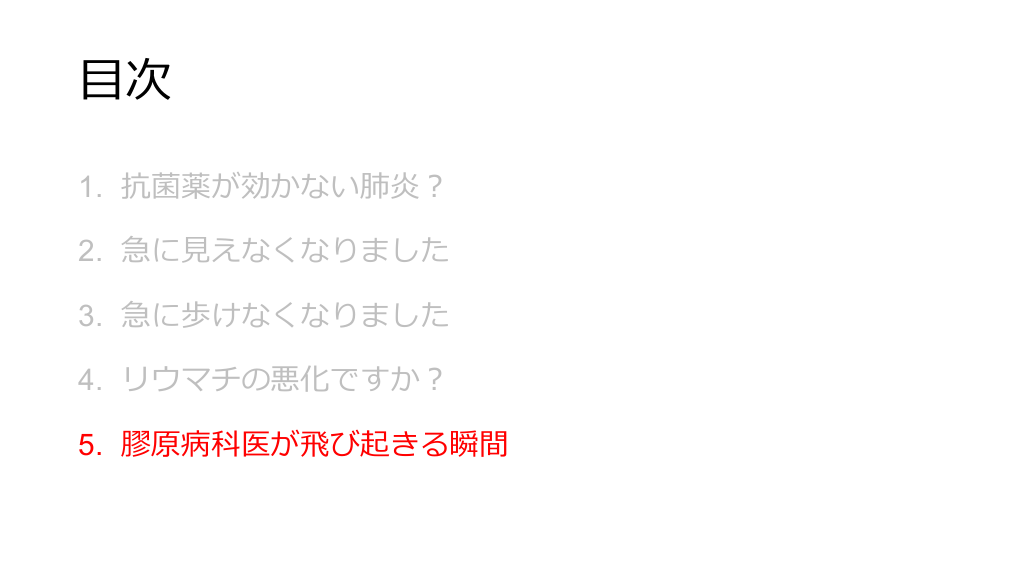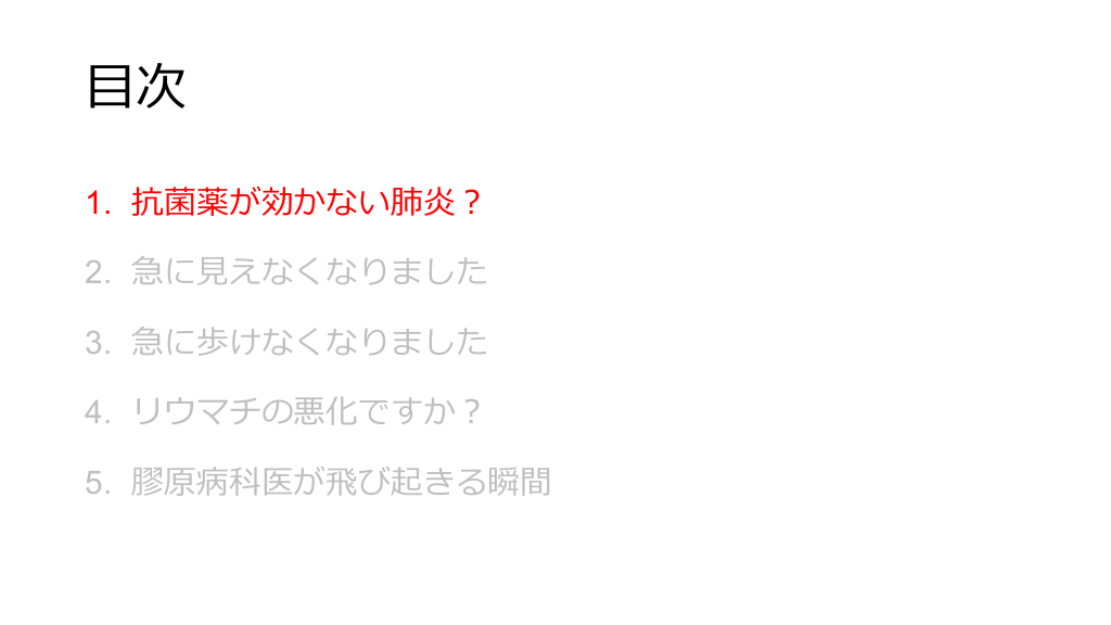 #41. 目次 1. 抗菌薬が効かない肺炎? 2. 急に見えなくなりました 3. 急に歩けなくなりました 4. リウマチの悪化ですか? 5. 膠原病科医が飛び起きる瞬間