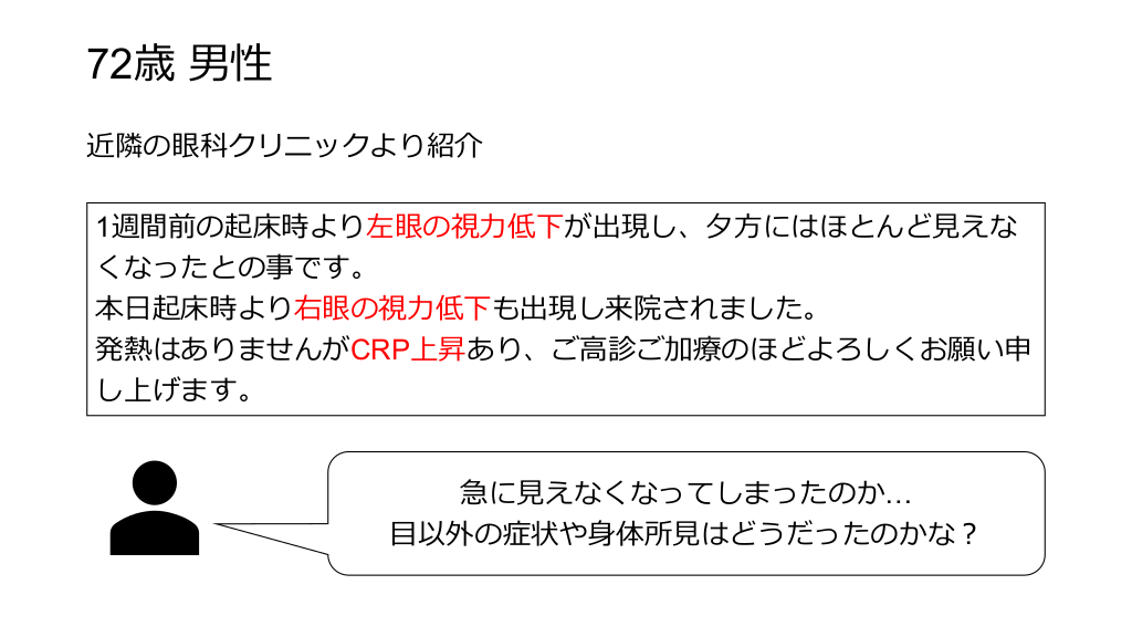 #16. 72歳 男性 近隣の眼科クリニックより紹介 1週間前の起床時より左眼の視力低下が出現し、夕方にはほとんど見えな くなったとの事です。 本日起床時より右眼の視力低下も出現し来院されました。 発熱はありませんがCRP上昇あり、ご高診ご加療のほどよろしくお願い申 し上げます。 急に見えなくなってしまったのか… 目以外の症状や身体所見はどうだったのかな?