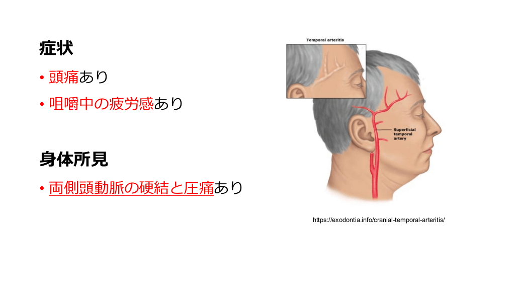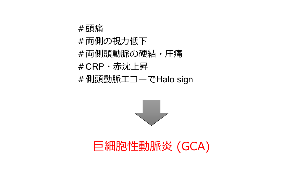 #19. #頭痛 #両側の視力低下 #両側頭動脈の硬結・圧痛 #CRP・赤沈上昇 #側頭動脈エコーでHalo sign 巨細胞性動脈炎 (GCA)
