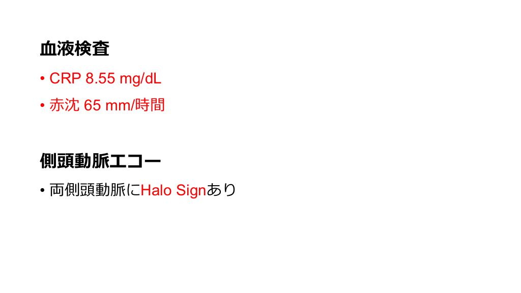 #18. 血液検査 • CRP 8.55 mg/dL • 赤沈 65 mm/時間 側頭動脈エコー • 両側頭動脈にHalo Signあり