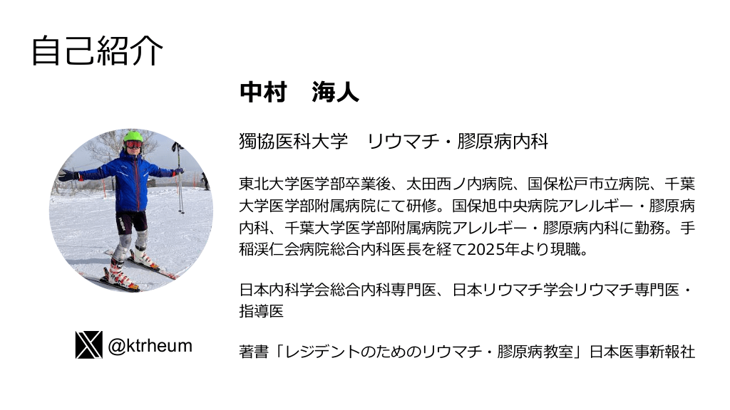 #2. 自己紹介 中村 海人 獨協医科大学 リウマチ・膠原病内科 東北大学医学部卒業後、太田西ノ内病院、国保松戸市立病院、千葉 大学医学部附属病院にて研修。国保旭中央病院アレルギー・膠原病 内科、千葉大学医学部附属病院アレルギー・膠原病内科に勤務。手 稲渓仁会病院総合内科医長を経て2025年より現職。 日本内科学会総合内科専門医、日本リウマチ学会リウマチ専門医・ 指導医 @ktrheum 著書「レジデントのためのリウマチ・膠原病教室」日本医事新報社