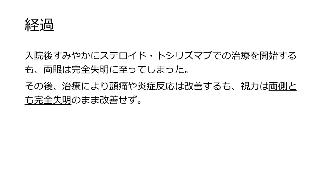 #20. 経過 入院後すみやかにステロイド・トシリズマブでの治療を開始する も、両眼は完全失明に至ってしまった。 その後、治療により頭痛や炎症反応は改善するも、視力は両側と も完全失明のまま改善せず。