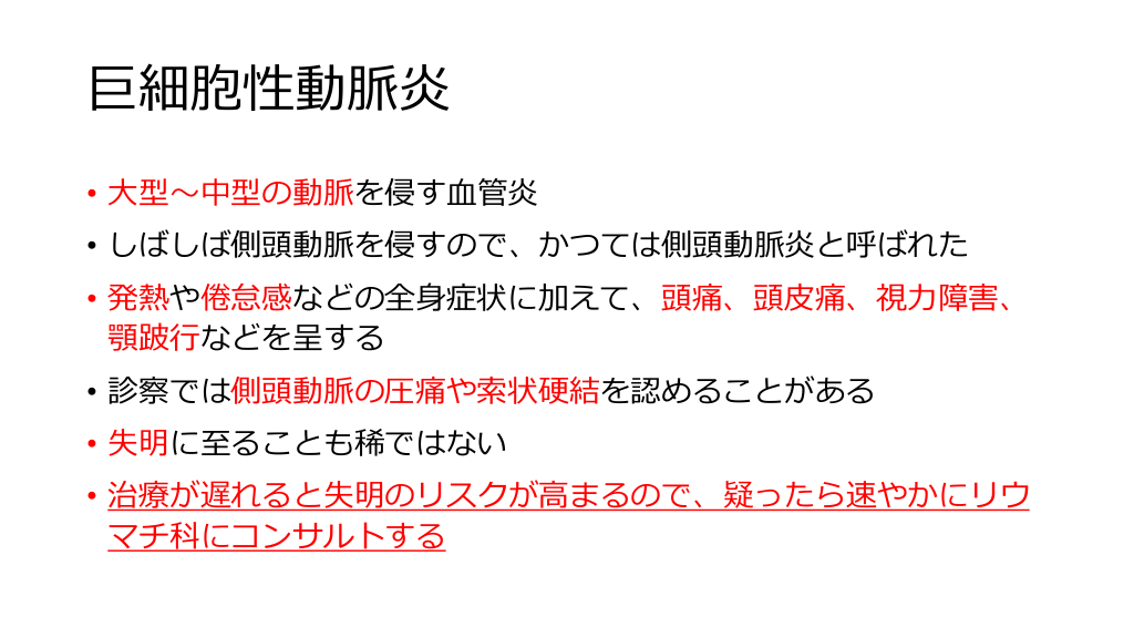 #21. 巨細胞性動脈炎 • 大型~中型の動脈を侵す血管炎 • しばしば側頭動脈を侵すので、かつては側頭動脈炎と呼ばれた • 発熱や倦怠感などの全身症状に加えて、頭痛、頭皮痛、視力障害、 顎跛行などを呈する • 診察では側頭動脈の圧痛や索状硬結を認めることがある • 失明に至ることも稀ではない • 治療が遅れると失明のリスクが高まるので、疑ったら速やかにリウ マチ科にコンサルトする