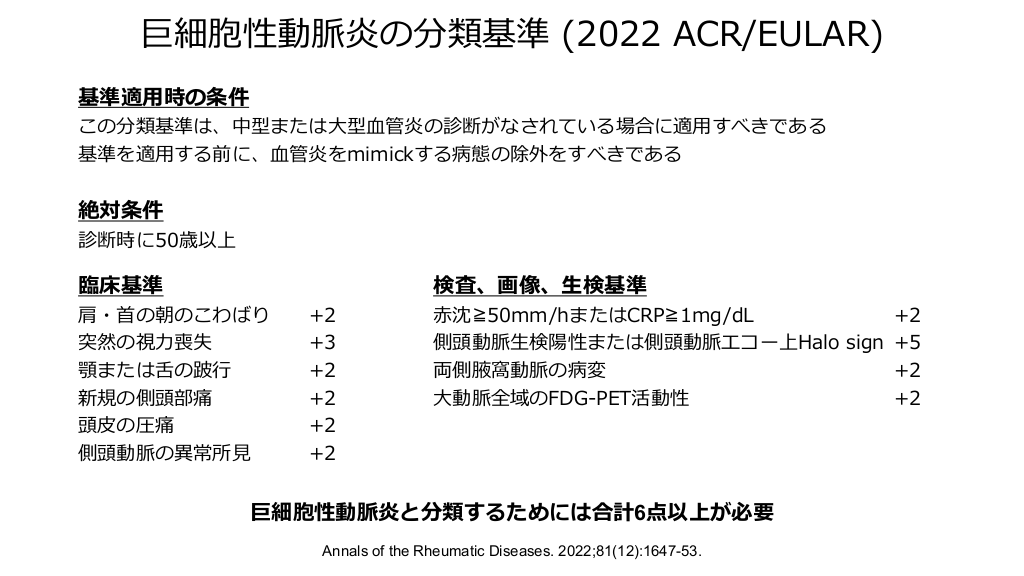 #23. 巨細胞性動脈炎の分類基準 (2022 ACR/EULAR) 基準適用時の条件 この分類基準は、中型または大型血管炎の診断がなされている場合に適用すべきである 基準を適用する前に、血管炎をmimickする病態の除外をすべきである 絶対条件 診断時に50歳以上 臨床基準 検査、画像、生検基準 肩・首の朝のこわばり 突然の視力喪失 顎または舌の跛行 新規の側頭部痛 頭皮の圧痛 側頭動脈の異常所見 +2 +3 +2 +2 +2 +2 赤沈≧50mm/hまたはCRP≧1mg/dL +2 側頭動脈生検陽性または側頭動脈エコー上Halo sign+5 両側腋窩動脈の病変 +2 大動脈全域のFDG-PET活動性 +2 巨細胞性動脈炎と分類するためには合計6点以上が必要 Annals of the Rheumatic Diseases. 2022;81(12):1647-53.