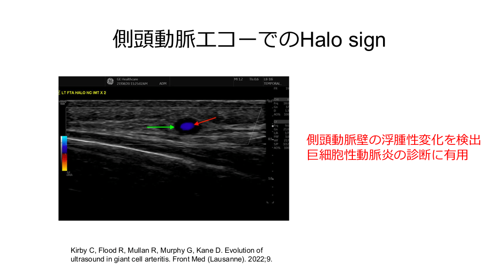 #24. 側頭動脈エコーでのHalo sign 側頭動脈壁の浮腫性変化を検出 巨細胞性動脈炎の診断に有用 Kirby C, Flood R, Mullan R, Murphy G, Kane D. Evolution of ultrasound in giant cell arteritis. Front Med (Lausanne). 2022;9.