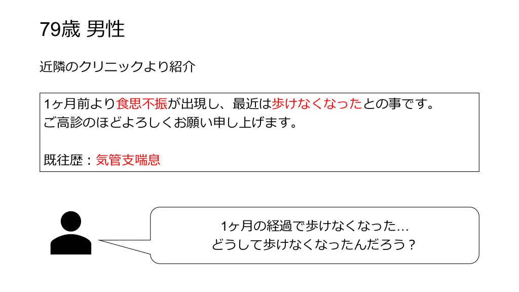 #27. 79歳 男性 近隣のクリニックより紹介 1ヶ月前より食思不振が出現し、最近は歩けなくなったとの事です。 ご高診のほどよろしくお願い申し上げます。 既往歴:気管支喘息 1ヶ月の経過で歩けなくなった… どうして歩けなくなったんだろう?