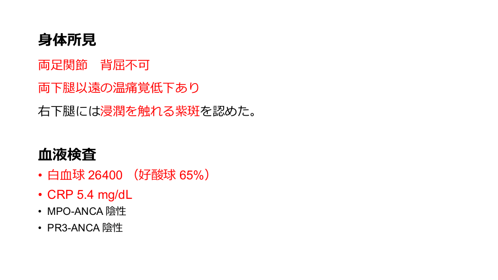 #28. 身体所見 両足関節 背屈不可 両下腿以遠の温痛覚低下あり 右下腿には浸潤を触れる紫斑を認めた。 血液検査 • 白血球 26400 (好酸球 65%) • CRP 5.4 mg/dL • MPO-ANCA 陰性 • PR3-ANCA 陰性
