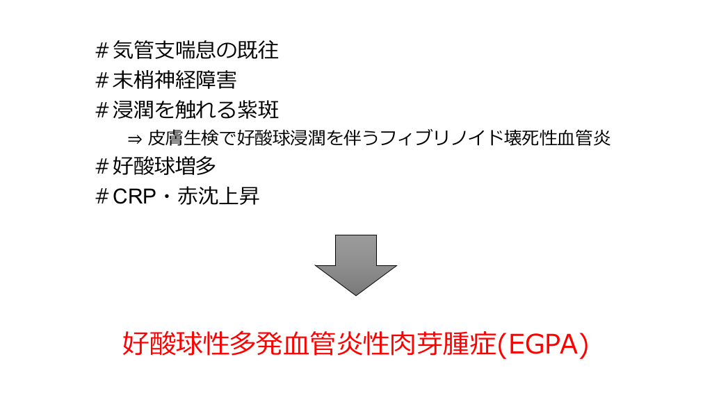 #29. #気管支喘息の既往 #末梢神経障害 #浸潤を触れる紫斑 ⇒ 皮膚生検で好酸球浸潤を伴うフィブリノイド壊死性血管炎 #好酸球増多 #CRP・赤沈上昇 好酸球性多発血管炎性肉芽腫症(EGPA)