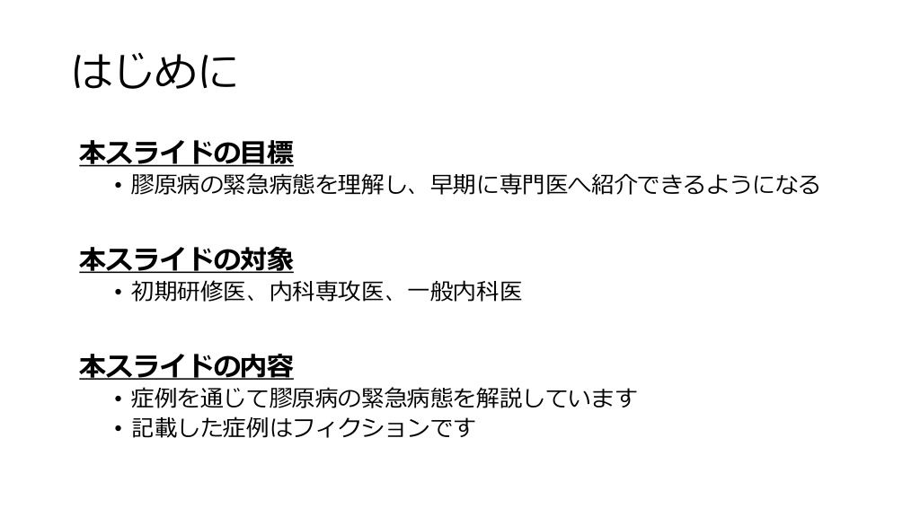 #3. はじめに 本スライドの目標 • 膠原病の緊急病態を理解し、早期に専門医へ紹介できるようになる 本スライドの対象 • 初期研修医、内科専攻医、一般内科医 本スライドの内容 • 症例を通じて膠原病の緊急病態を解説しています • 記載した症例はフィクションです