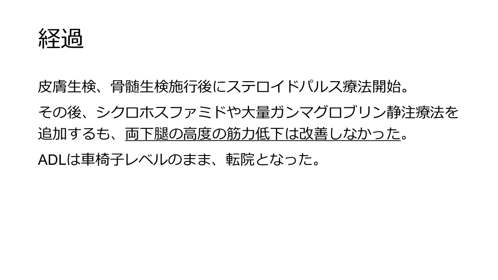 #30. 経過 皮膚生検、骨髄生検施行後にステロイドパルス療法開始。 その後、シクロホスファミドや大量ガンマグロブリン静注療法を 追加するも、両下腿の高度の筋力低下は改善しなかった。 ADLは車椅子レベルのまま、転院となった。