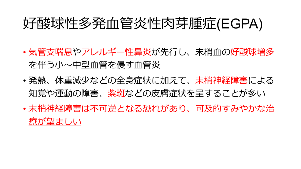 #34. EGPAの末梢神経障害は不可逆になりやすい! 好酸球増多と末梢神経障害の組み合わせでは EGPAを鑑別にあげよう!