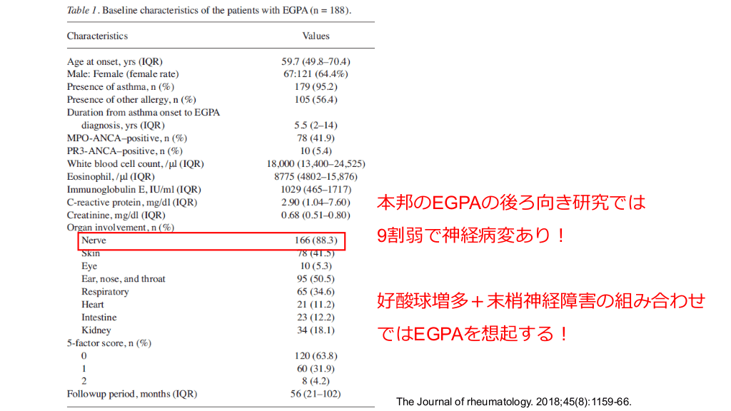 #32. 本邦のEGPAの後ろ向き研究では 9割弱で神経病変あり! 好酸球増多+末梢神経障害の組み合わせ ではEGPAを想起する! The Journal of rheumatology. 2018;45(8):1159-66.
