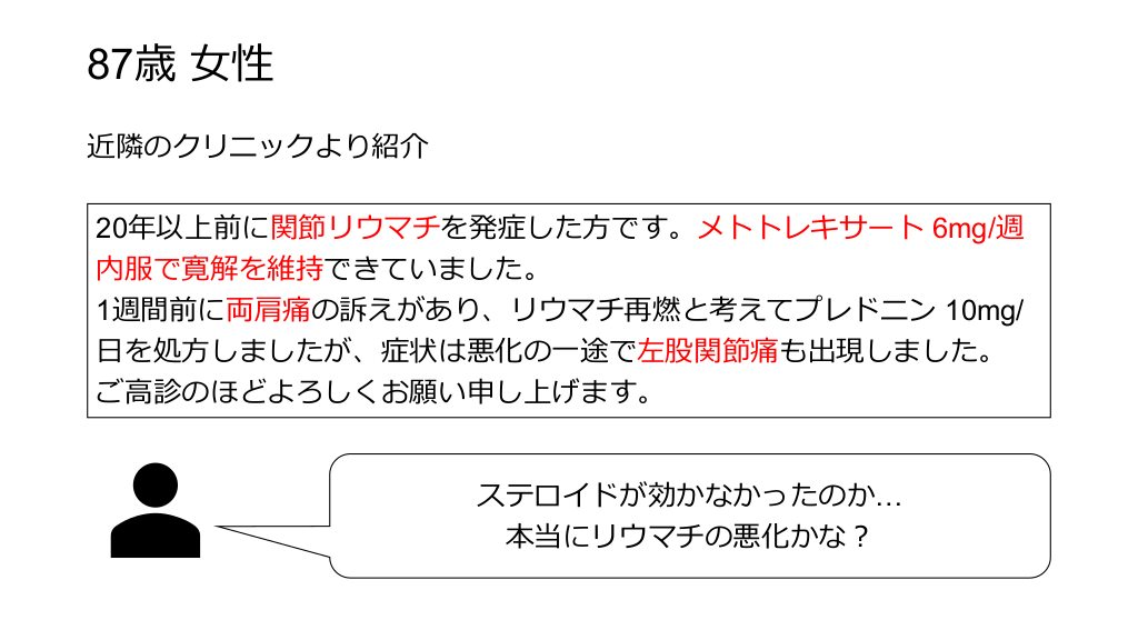 #36. 87歳 女性 近隣のクリニックより紹介 20年以上前に関節リウマチを発症した方です。メトトレキサート 6mg/週 内服で寛解を維持できていました。 1週間前に両肩痛の訴えがあり、リウマチ再燃と考えてプレドニン 10mg/ 日を処方しましたが、症状は悪化の一途で左股関節痛も出現しました。 ご高診のほどよろしくお願い申し上げます。 ステロイドが効かなかったのか… 本当にリウマチの悪化かな?