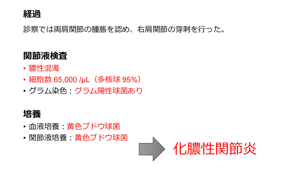 #37. 経過 診察では両肩関節の腫脹を認め、右肩関節の穿刺を行った。 関節液検査 • 膿性混濁 • 細胞数 65,000 /μL(多核球 95%) • グラム染色:グラム陽性球菌あり 培養 • 血液培養:黄色ブドウ球菌 • 関節液培養:黄色ブドウ球菌 化膿性関節炎
