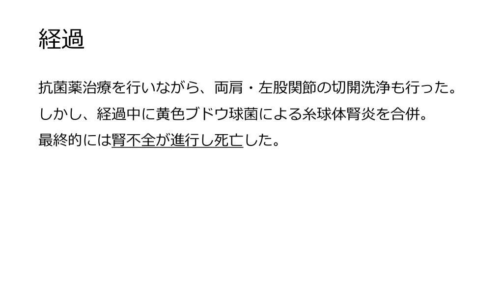 #38. 経過 抗菌薬治療を行いながら、両肩・左股関節の切開洗浄も行った。 しかし、経過中に黄色ブドウ球菌による糸球体腎炎を合併。 最終的には腎不全が進行し死亡した。