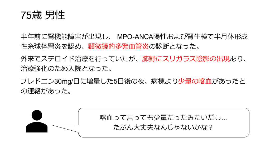 #42. 75歳 男性 半年前に腎機能障害が出現し、 MPO-ANCA陽性および腎生検で半月体形成 性糸球体腎炎を認め、顕微鏡的多発血管炎の診断となった。 外来でステロイド治療を行っていたが、肺野にスリガラス陰影の出現あり、 治療強化のため入院となった。 プレドニン30mg/日に増量した5日後の夜、病棟より少量の喀血があったと の連絡があった。 喀血って言っても少量だったみたいだし… たぶん大丈夫なんじゃないかな?