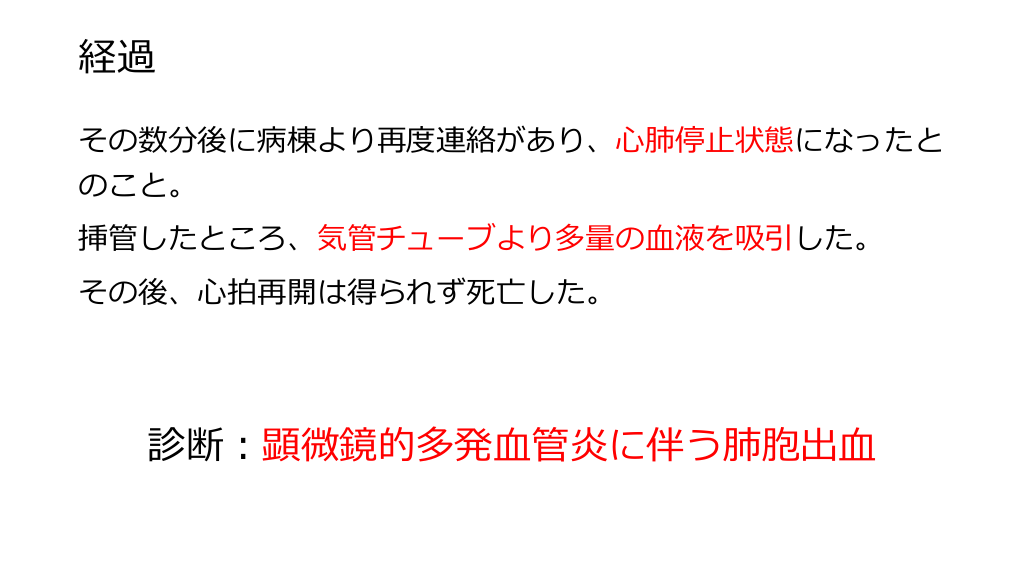 #43. 経過 その数分後に病棟より再度連絡があり、心肺停止状態になったと のこと。 挿管したところ、気管チューブより多量の血液を吸引した。 その後、心拍再開は得られず死亡した。 診断:顕微鏡的多発血管炎に伴う肺胞出血
