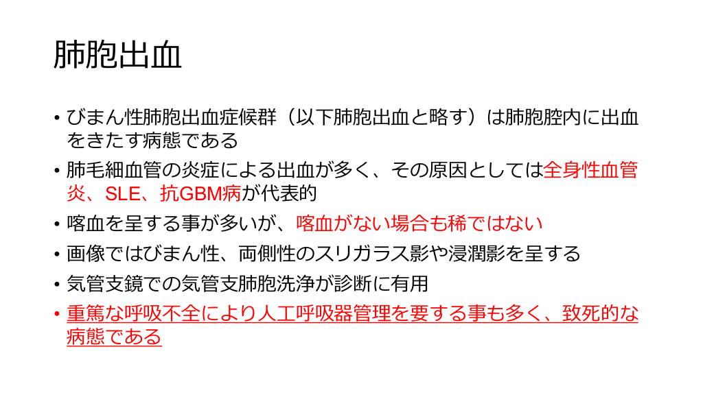 #44. 肺胞出血 • びまん性肺胞出血症候群(以下肺胞出血と略す)は肺胞腔内に出血 をきたす病態である • 肺毛細血管の炎症による出血が多く、その原因としては全身性血管 炎、SLE、抗GBM病が代表的 • 喀血を呈する事が多いが、喀血がない場合も稀ではない • 画像ではびまん性、両側性のスリガラス影や浸潤影を呈する • 気管支鏡での気管支肺胞洗浄が診断に有用 • 重篤な呼吸不全により人工呼吸器管理を要する事も多く、致死的な 病態である