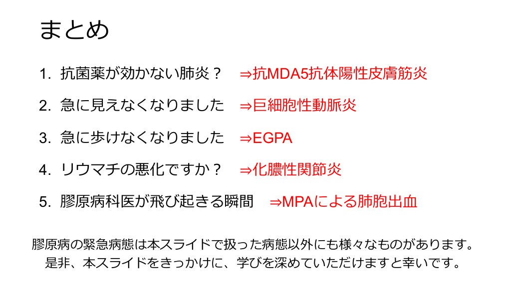 #46. まとめ 1. 抗菌薬が効かない肺炎? ⇒抗MDA5抗体陽性皮膚筋炎 2. 急に見えなくなりました ⇒巨細胞性動脈炎 3. 急に歩けなくなりました ⇒EGPA 4. リウマチの悪化ですか? ⇒化膿性関節炎 5. 膠原病科医が飛び起きる瞬間 ⇒MPAによる肺胞出血 膠原病の緊急病態は本スライドで扱った病態以外にも様々なものがあります。 是非、本スライドをきっかけに、学びを深めていただけますと幸いです。