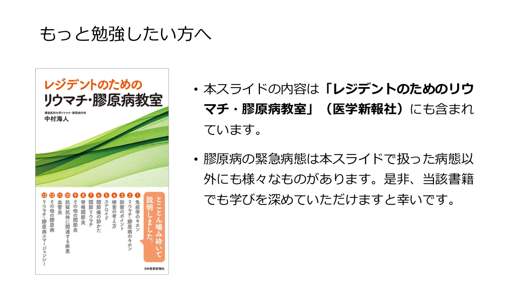 #47. もっと勉強したい方へ • 本スライドの内容は「レジデントのためのリウ マチ・膠原病教室」(医学新報社)にも含まれ ています。 • 膠原病の緊急病態は本スライドで扱った病態以 外にも様々なものがあります。是非、当該書籍 でも学びを深めていただけますと幸いです。