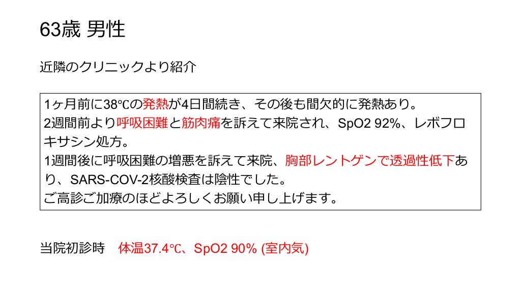 #6. 63歳 男性 近隣のクリニックより紹介 1ヶ月前に38℃の発熱が4日間続き、その後も間欠的に発熱あり。 2週間前より呼吸困難と筋肉痛を訴えて来院され、SpO2 92%、レボフロ キサシン処方。 1週間後に呼吸困難の増悪を訴えて来院、胸部レントゲンで透過性低下あ り、SARS-COV-2核酸検査は陰性でした。 ご高診ご加療のほどよろしくお願い申し上げます。 当院初診時 体温37.4℃、SpO2 90% (室内気)