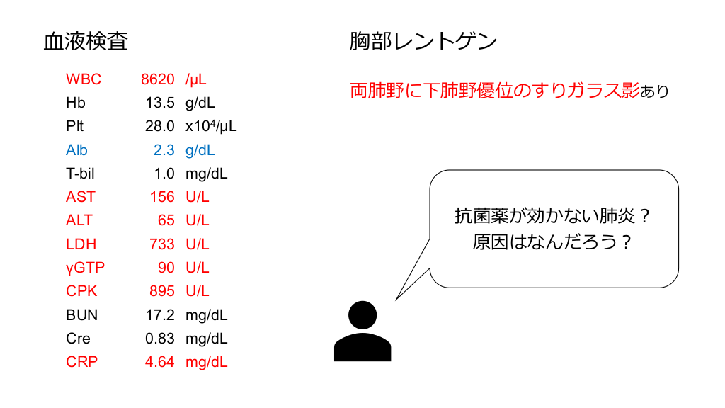 #7. 血液検査 胸部レントゲン WBC 8620 /μL Hb 13.5 g/dL Plt 28.0 x104/μL Alb 2.3 g/dL T-bil 1.0 mg/dL AST 156 U/L ALT 65 U/L LDH 733 U/L γGTP 90 U/L CPK 895 U/L BUN 17.2 mg/dL Cre 0.83 mg/dL CRP 4.64 mg/dL 両肺野に下肺野優位のすりガラス影あり 抗菌薬が効かない肺炎? 原因はなんだろう?
