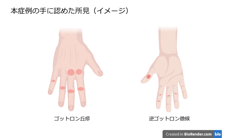 #8. 本症例の手に認めた所見(イメージ) ゴットロン丘疹 逆ゴットロン徴候