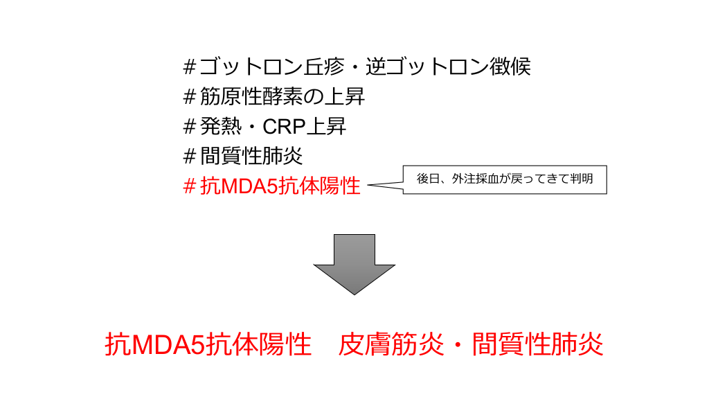 #9. #ゴットロン丘疹・逆ゴットロン徴候 #筋原性酵素の上昇 #発熱・CRP上昇 #間質性肺炎 後日、外注採血が戻ってきて判明 #抗MDA5抗体陽性 抗MDA5抗体陽性 皮膚筋炎・間質性肺炎