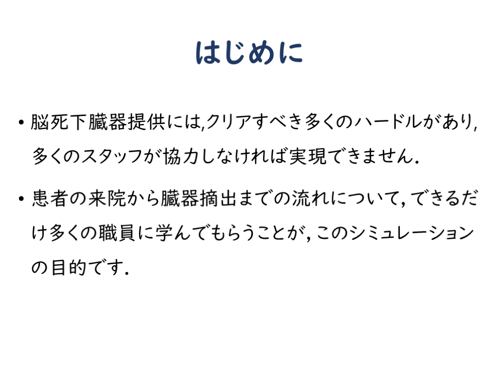 患者の来院から臓器摘出までの流れについて,できるだけ多くの職員に学んでもらうことが,このシミュレーションの目的です.