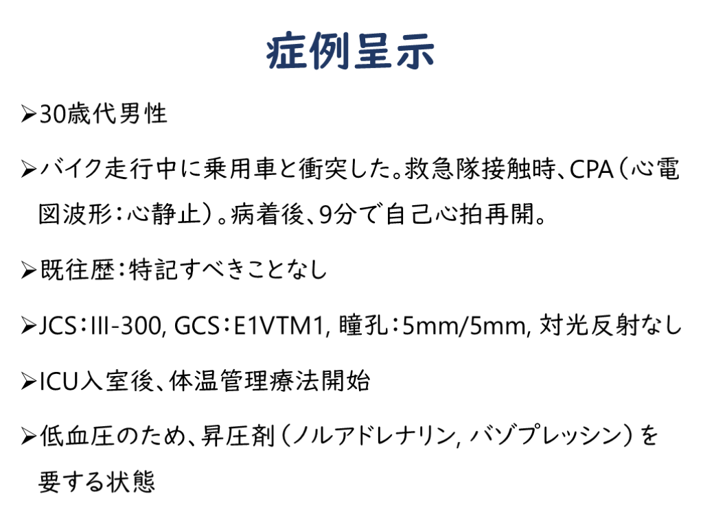 バイク走行中に乗用車と衝突した。救急隊接触時、CPA(心電図波形:心静止)。病着後、9分で自己心拍再開。