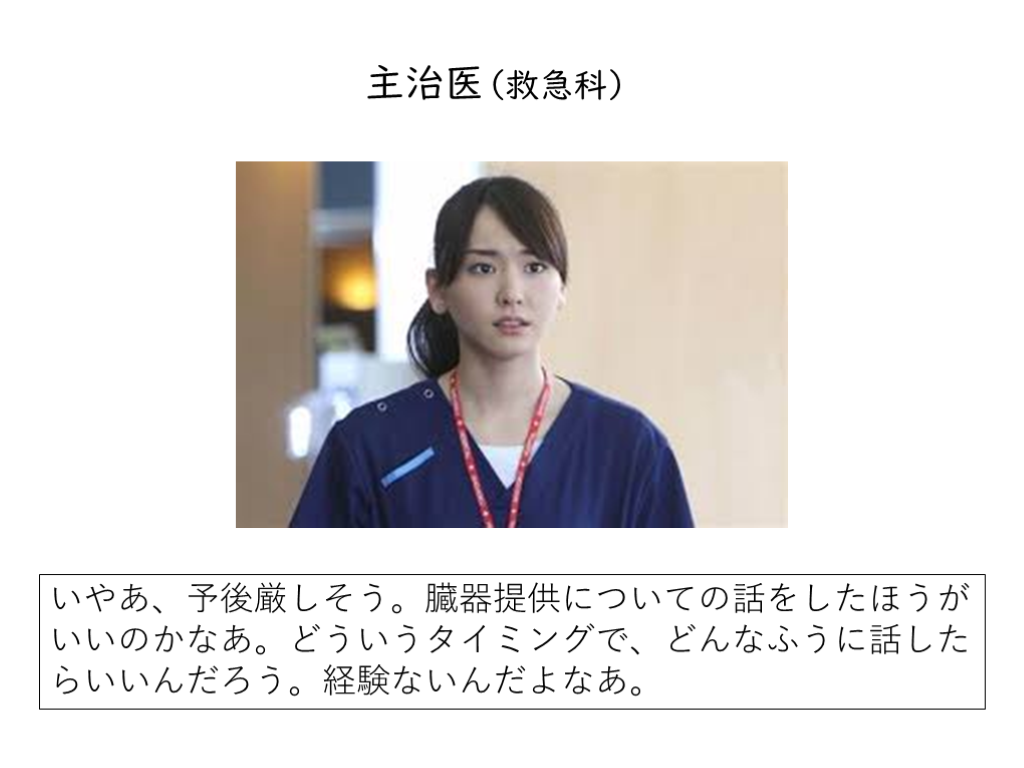 #9. いやあ、予後厳しそう。臓器提供についての話をしたほうがいいのかなあ。どういうタイミングで、どんなふうに話したらいいんだろう。経験ないんだよなあ。 主治医(救急科)