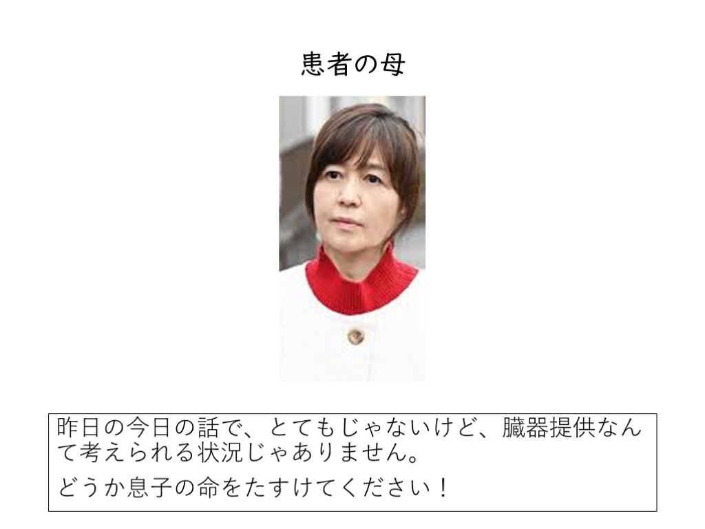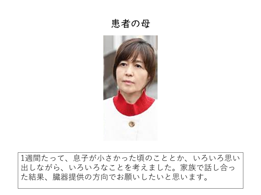 #27. 患者の母 1週間たって、息子が小さかった頃のこととか、いろいろ思い出しながら、いろいろなことを考えました。家族で話し合った結果、臓器提供の方向でお願いしたいと思います。