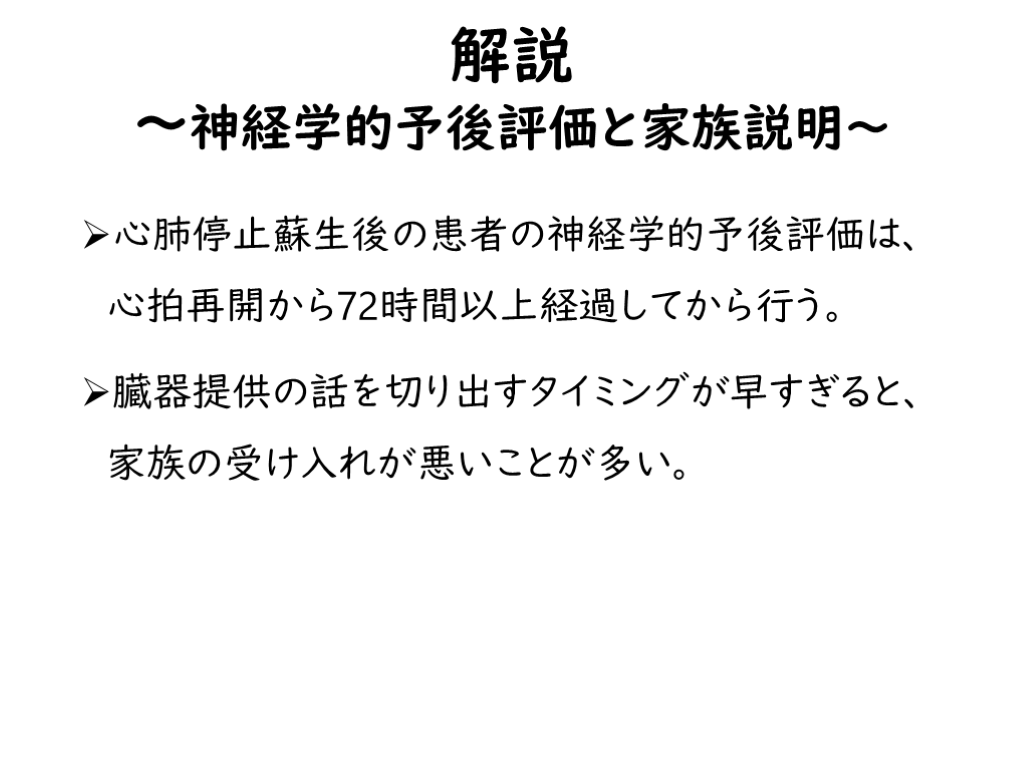 #22. 解説~神経学的予後評価と家族説明~ 心肺停止蘇生後の患者の神経学的予後評価は、心拍再開から72時間以上経過してから行う。