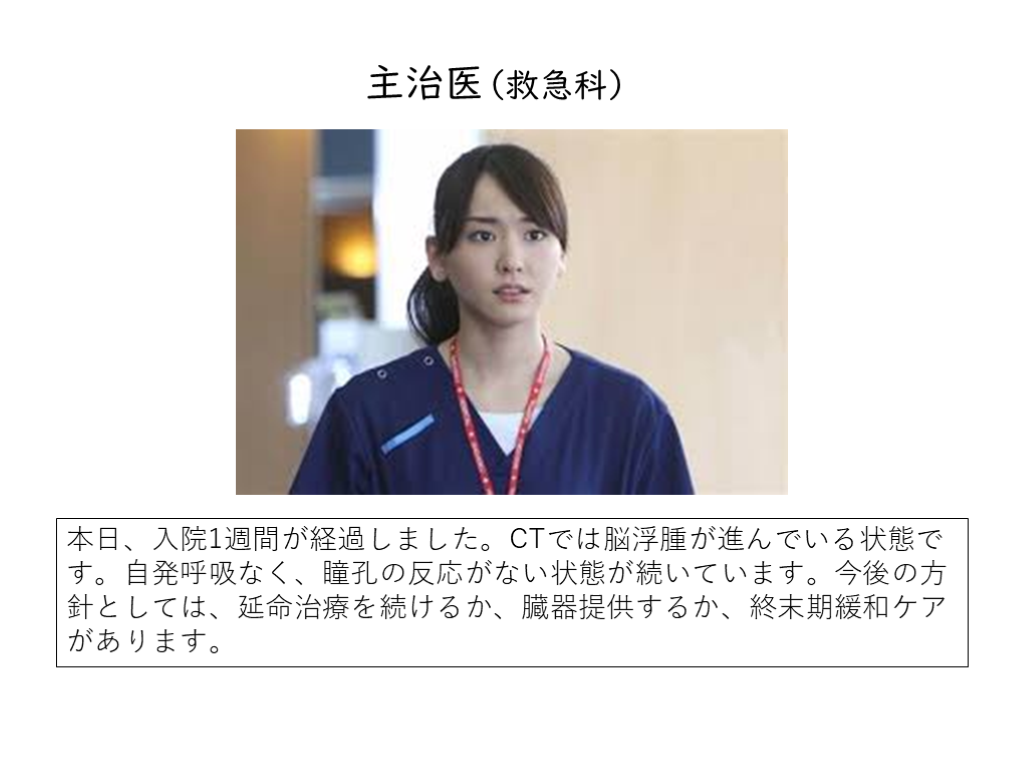 #26. 本日、入院1週間が経過しました。CTでは脳浮腫が進んでいる状態です。自発呼吸なく、瞳孔の反応がない状態が続いています。今後の方針としては、延命治療を続けるか、臓器提供するか、終末期緩和ケアがあります。 主治医(救急科)