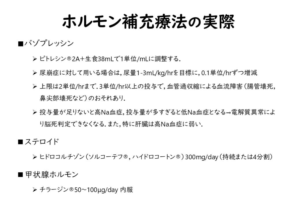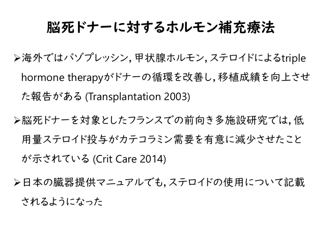 日本の臓器提供マニュアルでも,ステロイドの使用について記載されるようになった 脳死ドナーに対するホルモン補充療法