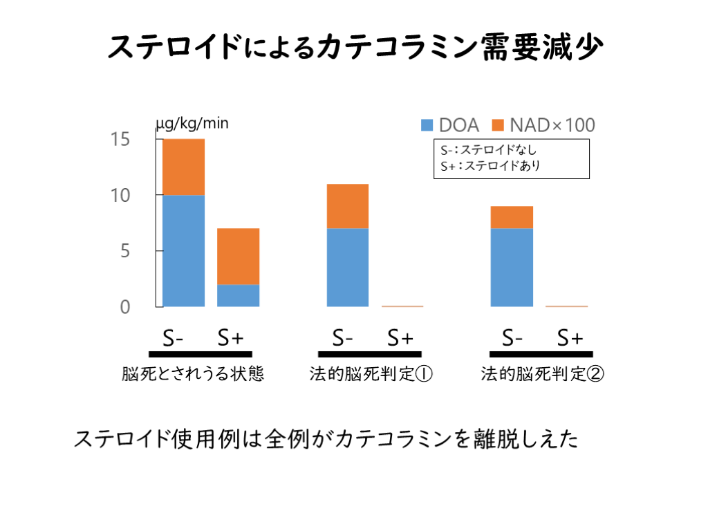 脳死ドナーを対象としたフランスでの前向き多施設研究では,低用量ステロイド投与がカテコラミン需要を有意に減少させたことが示されている (Crit Care 2014)
