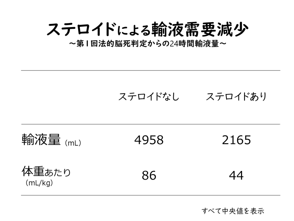 #38. ステロイドによる輸液需要減少~第1回法的脳死判定からの24時間輸液量~ すべて中央値を表示